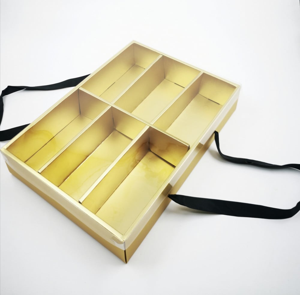 علب ورقيه ذهبيهالربطه تحتوي على 12 علبهتاتي شريطه من اجود انواع الاشرطه مركبه من الجوانبالمقسم قابل للازالهالمقاس الكلي 35 في 25 ارتفاع 6ونص